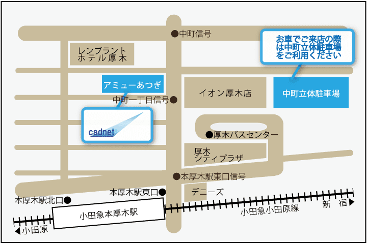 東名厚木ICより国道129号線にて約10分。圏央道厚木ICから国道129号線にて約10分。 (イオン厚木店裏側の中町立体駐車場をご利用ください)