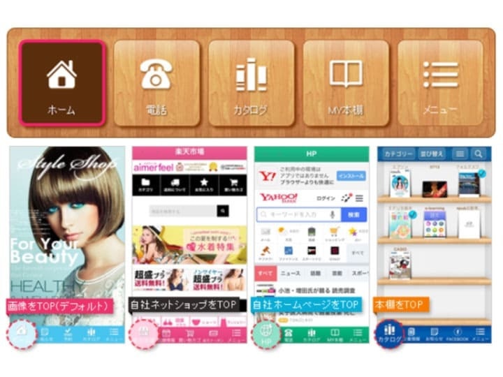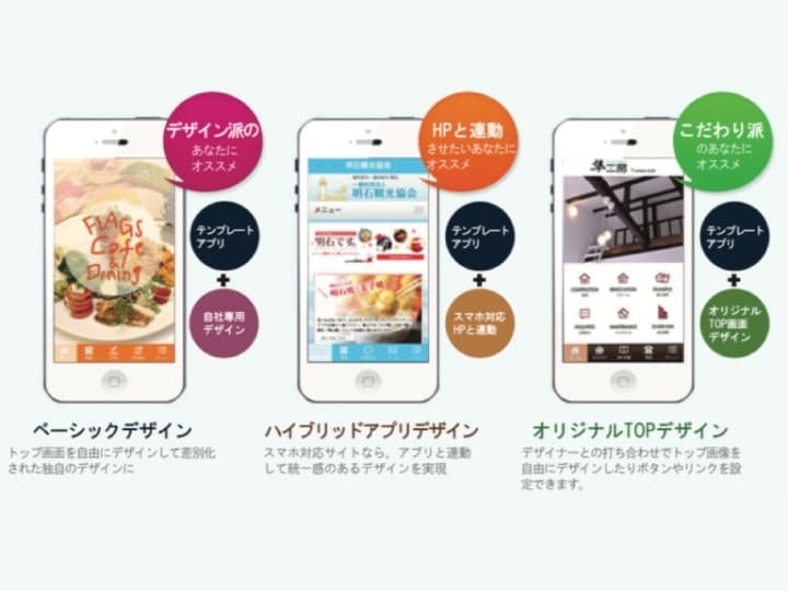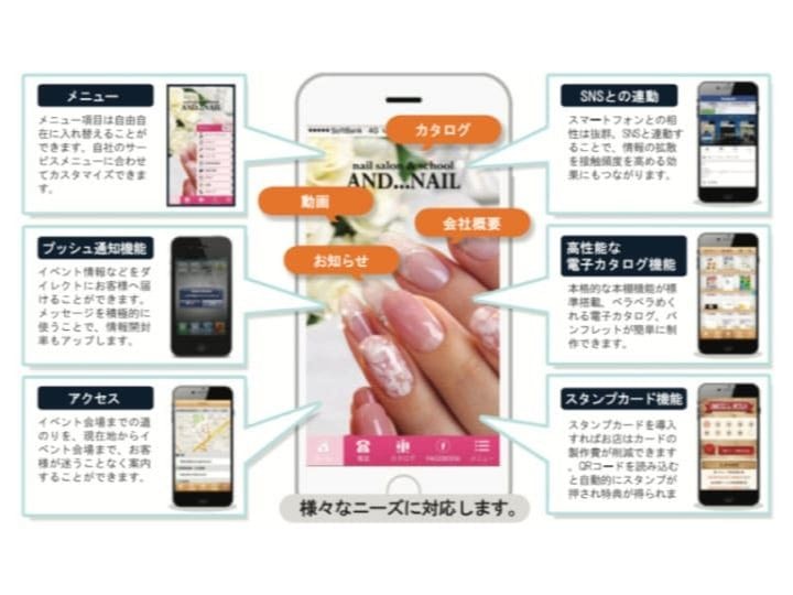 飲食店、エステ、美容院、コーポレイト、ECサイト、学校、病院、ホテル、旅行社、工務店、アーティスト、アスリート、個人、上場企業などのIRアプリ、企業のリクルートアプリ、会員だけに提供する会員アプリ、社内だけが利用する非公開アプリなどどんな業種にも適用できます。デザインやメニュー名なども自由に変更ができます。